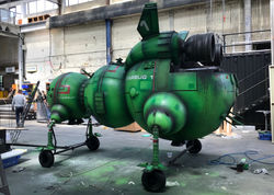 Work involved sampling then preparing the polystyrene polyurethane coated construction with Toupret Powdered Interior Filler. Sanding back for a smooth surface. Priming and painting in Green Deluxe Trade paint using a spray gun. Applying vinyl stickers and red, black and white tape. Spraying dark green and dark brown paint over stencils to create more depth. Washes of black paint and Mylands Gloss Glaze to represent oil.
